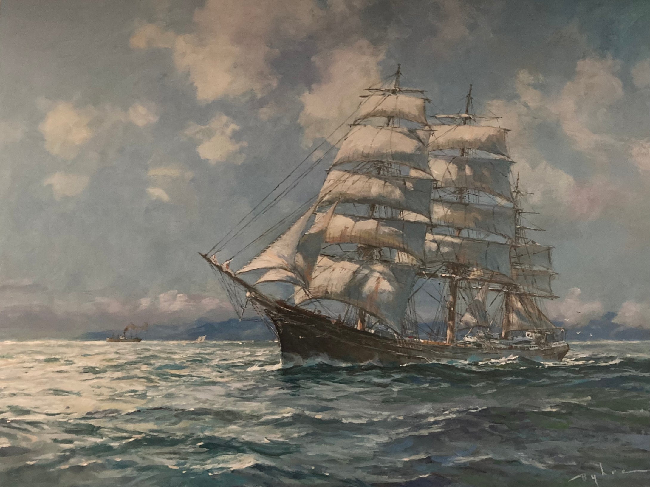 The veteran Down East ship W F Babcock under sail as she leaves the Strait of Juan de Fuca, in 1900, with a load of northwest timber