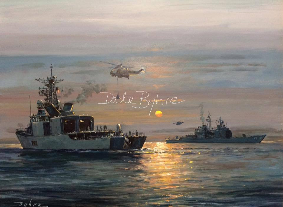 This work depicts HMCS Athabaskan providing aid and assistance to the cruiser USS Princeton after the ship was damaged by a mine detonating nearby on Feb. 18, 1991. HMCS Athabaskan was part of Canada's naval contribution to the Gulf War, and was specifically requested to assist the Princeton by her commanding officer.