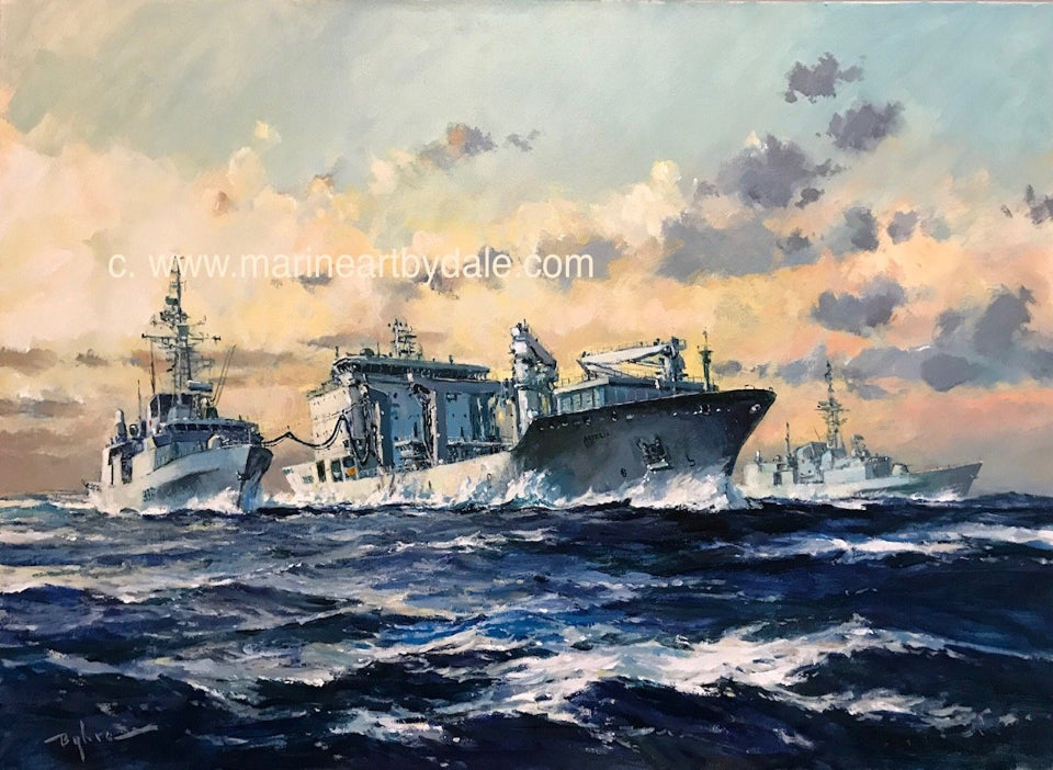 Two RCN frigates engage in refuelling from the Federal Fleet Services supply ship MV Asterix, during a Pacific deployment.