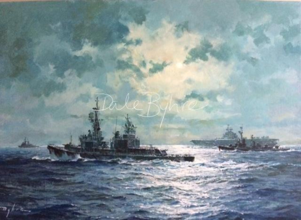 'Elements of Task Force 77, steam under a full moon on Yankee Station in the Gulf of Tonkin. Four types of ships are represented and they include an Essex class carrier, a Leahy class guided missile 'frigate,' a Forrest Sherman class destroyer and a modernized Fram II, Gearing class destroyer.