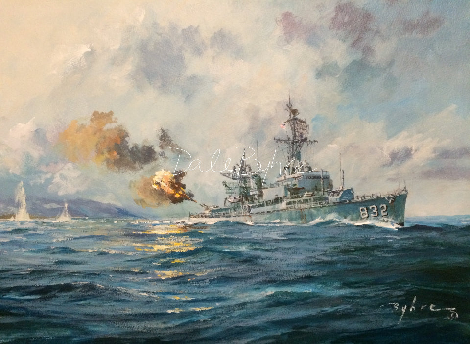 The US destroyer USS Hanson is depicted off the coast of North Vietnam exchanging gunfire with enemy coastal artillery.
